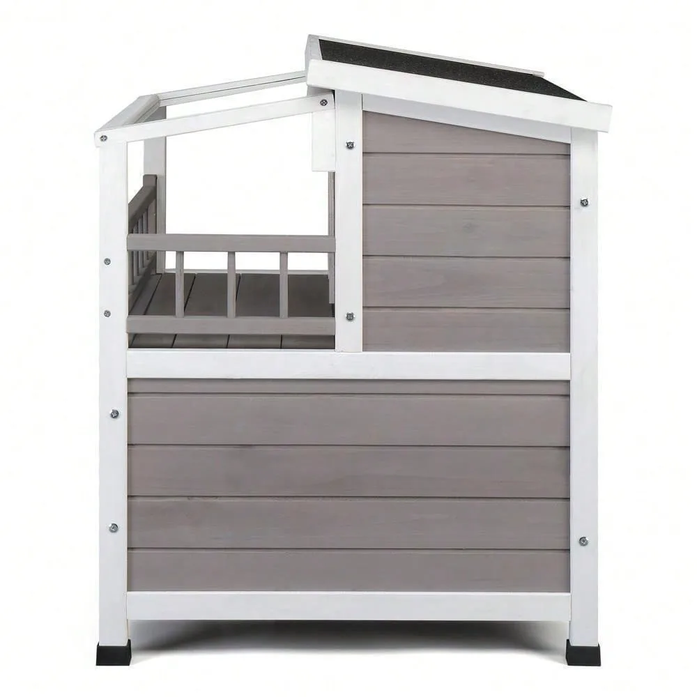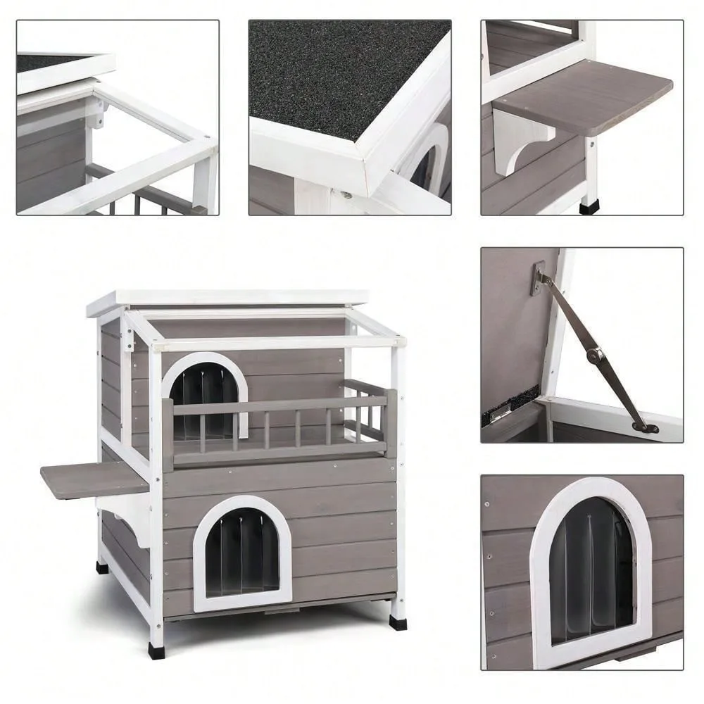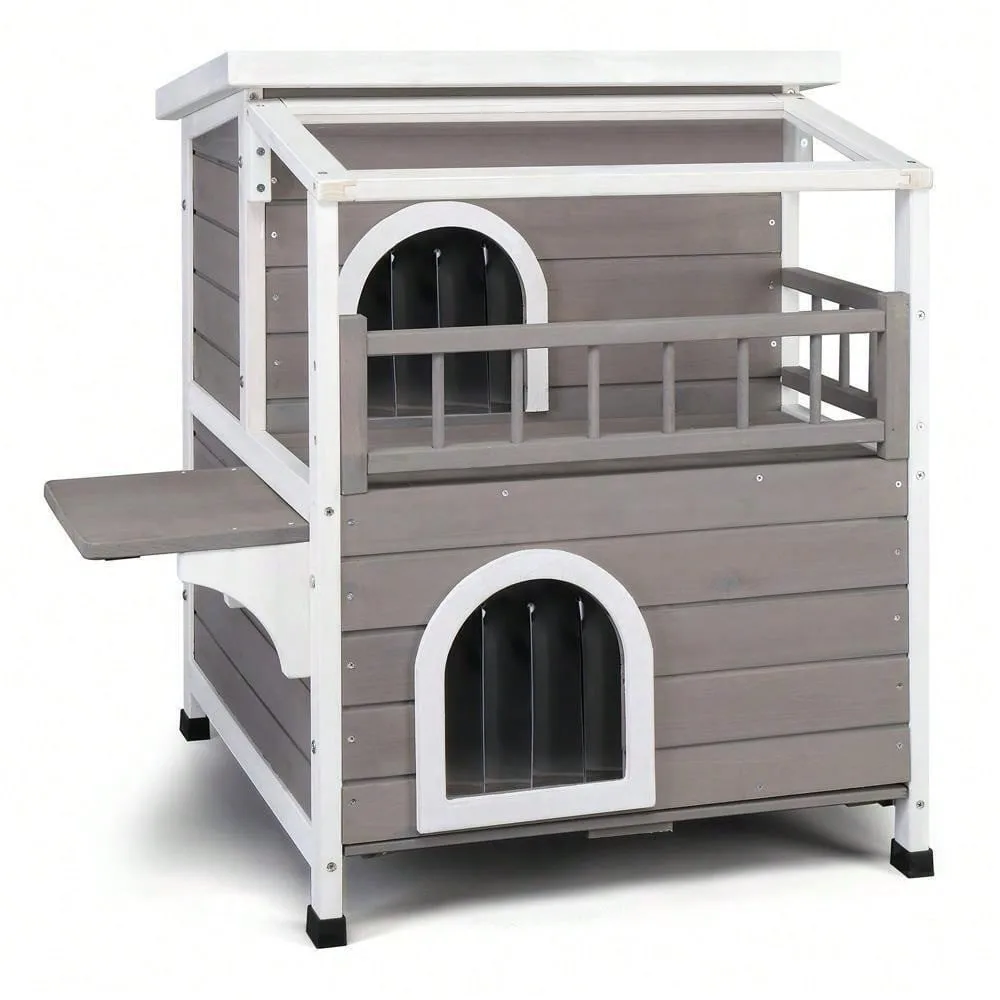 Outdoor Wood 2-Floor Cat Condo Pet House Kitty Shelter With Stairs Balcony